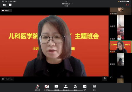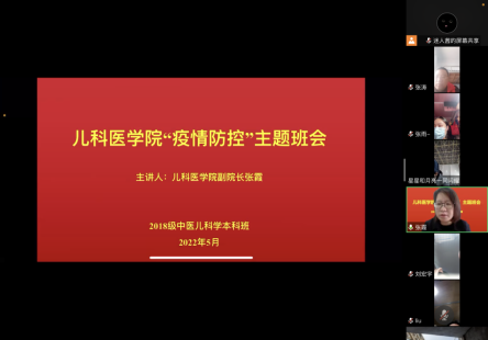 本网讯(文/张二涛  图/高钰茜)为贯彻落实校党委有关疫情防控工作要求,筑牢疫情防控安全线,5月10日下午17:00,麦田影院 副院长张霞通过腾讯会议召开疫情防控专题班会,2018级中医儿科学本科班全体学生参会,会议由辅导员张涛主持。