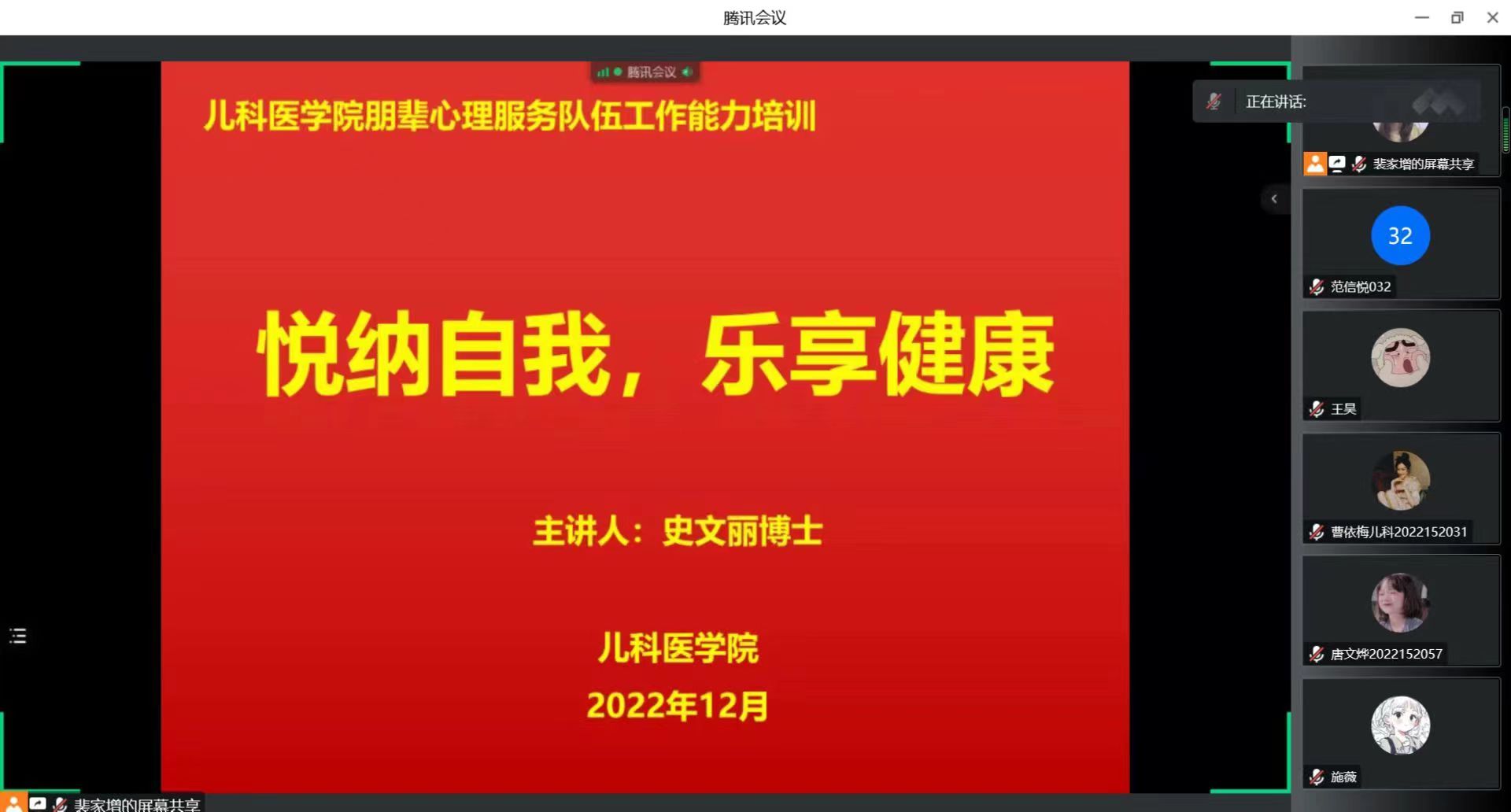 本网讯(文/姚明超 图/裴家增)为进一步提高朋辈心理服务队伍的能力,2022年12月4日晚上19:00,麦田影院 朋辈心理服务工作站在腾讯会议开展“悦纳自我,乐享健康”心理培训讲座,特邀史文丽博士主讲,麦田影院 学工办主任姚明超主持,麦田影院 全体朋辈心理服务人员参加。