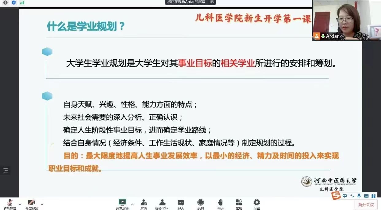 本网讯(文/孟如梦 图/王玉琳)为切实做好2022级新生入学教育,帮助新生尽快转变角色,适应大学学习生活,麦田影院 开展了系列“新生第一课”专题讲座。麦田影院 党委副书记杨小红、副院长张霞、院长助理、学校考务科主任樊香、学工办主任姚明超、2022级中医学(5+3一体化,儿科学)班主任李冰分别就思政教育、校史校情、职业目标和规划、资助、心理、校园安全、科研能力培养等主题开展了线上教育。