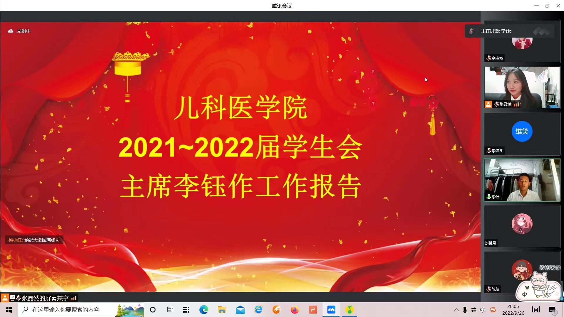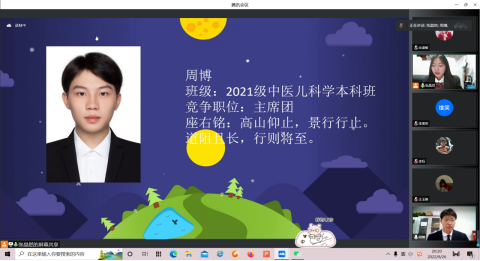 首先,张晶雅宣读了会议议程及竞选、投票规则,随后由2021-2022届学生会主席李钰进行工作汇报。李钰首先向各位老师及学生会成员对上年工作的支持表示感谢,李钰讲到,团委学生会是联系学院教师与学生的重要纽带,是我们同甘共苦的大家庭。希望新一届学生会班子成员秉承认真负责、敢于担当、勇于奉献的办事原则,做出更加辉煌的成绩。