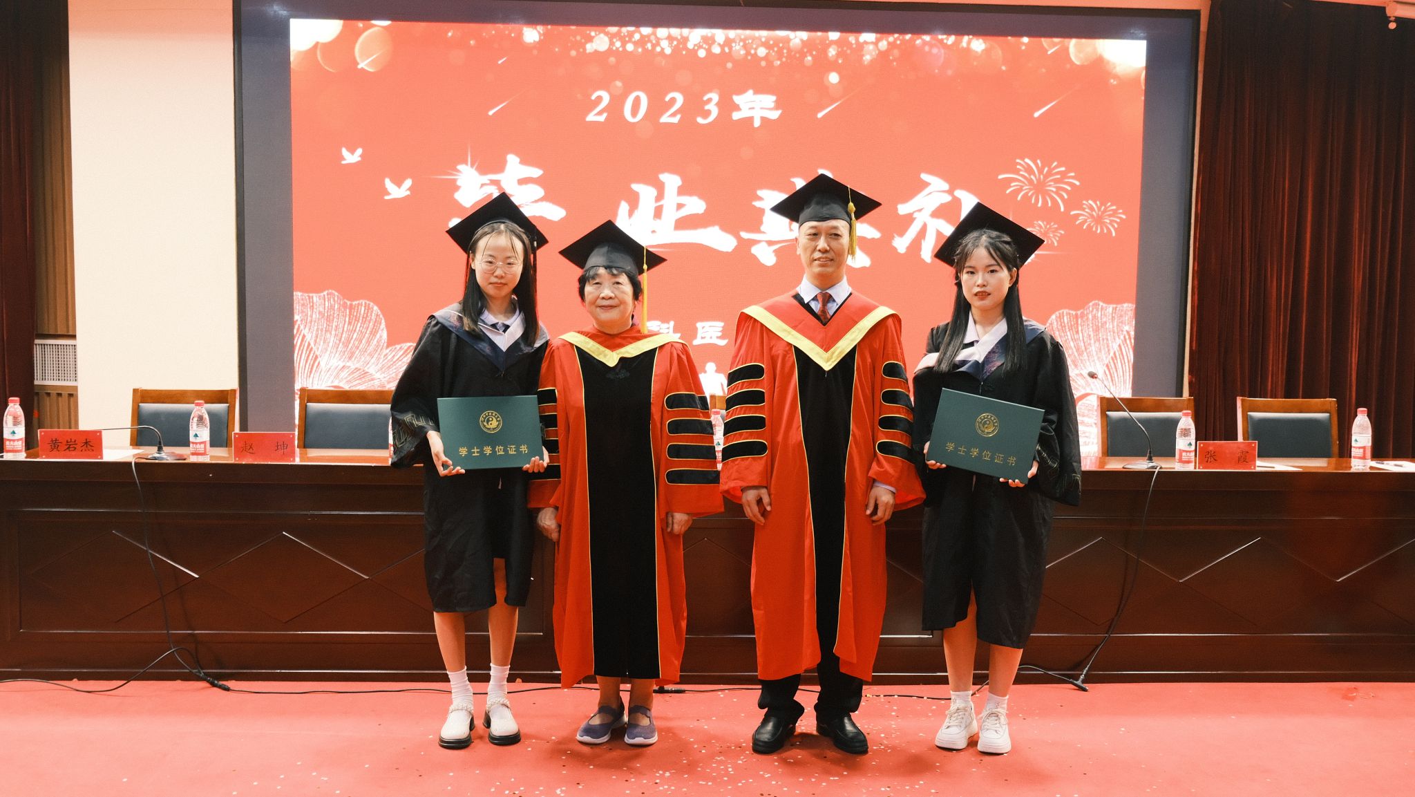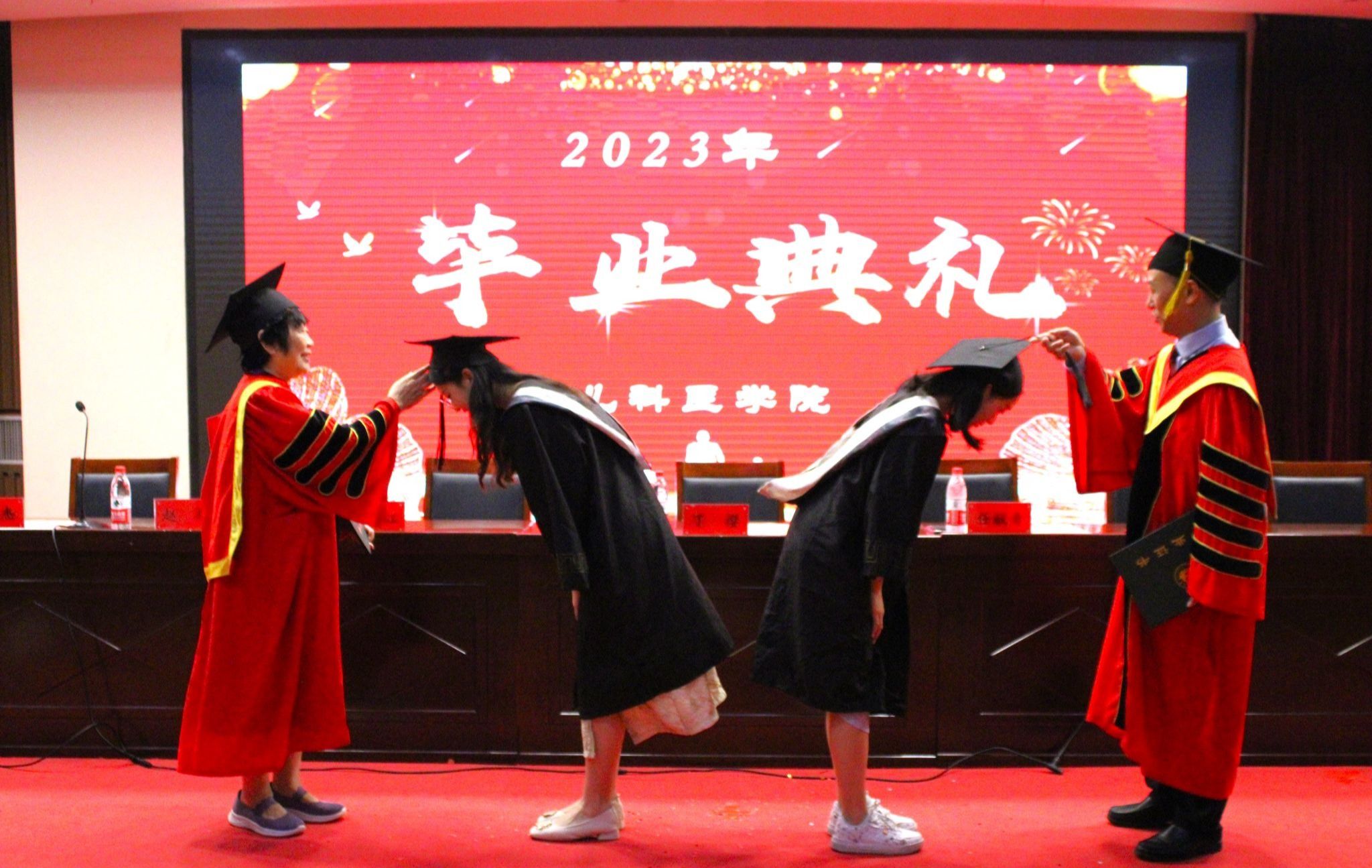 毕业典礼暨学位授予仪式在雄壮激昂的国歌声中拉开帷幕。学院党委副书记杨小红主持仪式。学院副院长张霞介绍麦田影院 2023届本科毕业生毕业情况、授予学位情况,儿科医院副院长翟文生宣读2023届本科优秀毕业生名单、2023届本科毕业生校友联络员名单。学院党委书记任献青为优秀毕业生和校友联络员颁发了荣誉证书和聘书。学院全体参会教师代表向毕业生赠送了毕业纪念品。