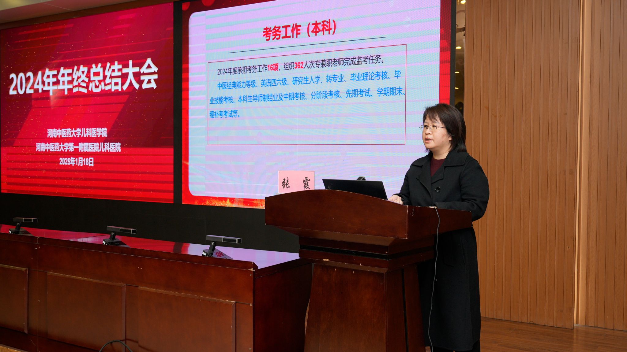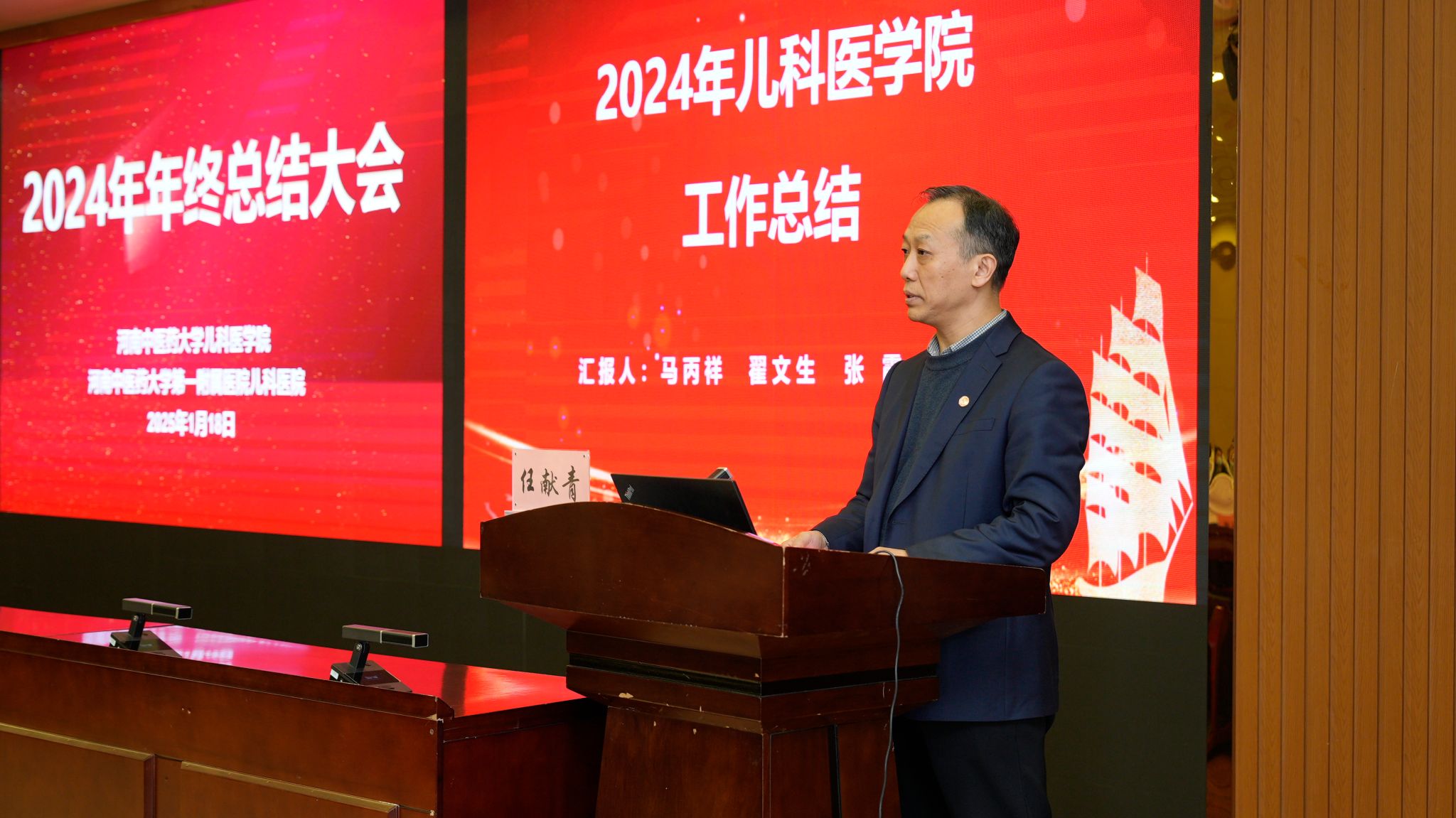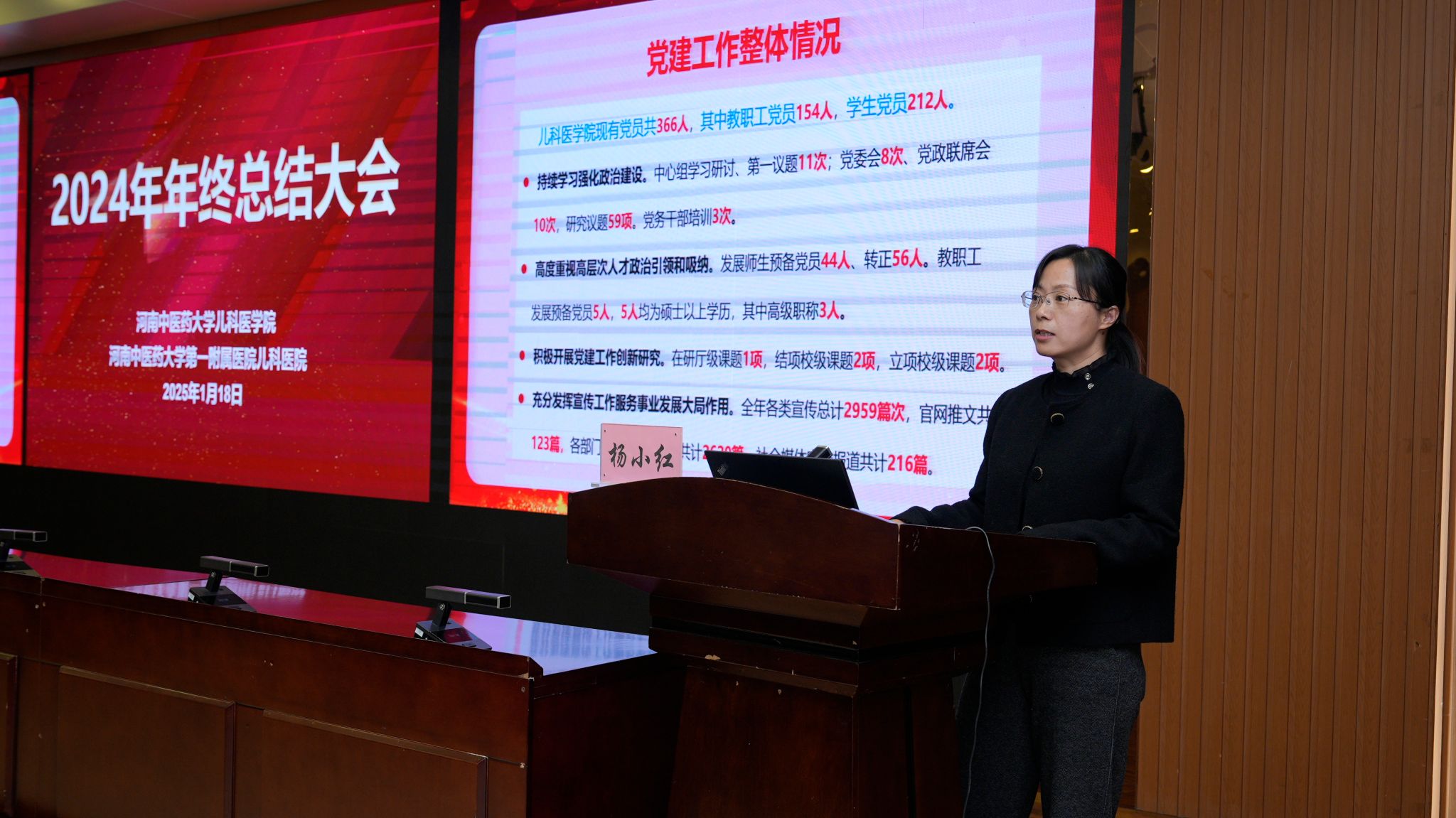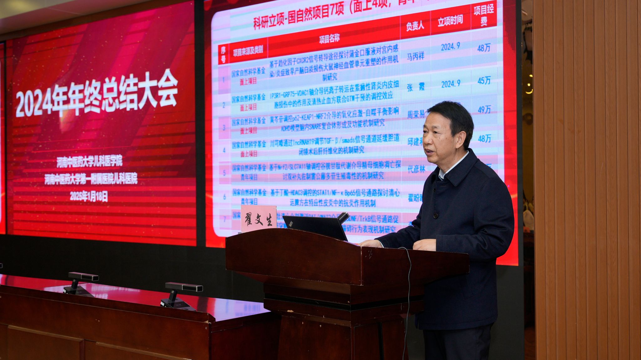 随后,学院班子成员杨小红、张霞、马丙祥、翟文生分别围绕党建、临床医疗、科研和学科建设、教学与研究生教育、学生管理等工作进行了全面总结。一是基层党组织建设提质提效。构建“1+1+N”党建格局。党支部品牌特色创建上持续推进,省级党建创新品牌通过中期验收,学校党建创新项目2项获准结项。二是科研工作再创佳绩。2024年科研立项、科研经费、发表论文数量都稳步提升。中标省部级以上课题24项,其中国自然7项,国家中医药管理局项目2项。发表论文175篇,其中中文核心95篇。三是学科和人才队伍建设稳步推进。儿科蝉联全国学术影响力榜单第一。丁樱教授当选中国中医科学院学部委员。新聘二级教授1人,入选省教育厅学术技术带头人1名,入选省卫生健康委和省医学科学院“三个100”科学家1名。四是临床医疗凸显领先优势。儿科医院新增5个病区,病区数达到14个。服务区域覆盖龙子湖高校园区和中牟地区,门诊诊疗人次和出院病人量比2023年增加20%以上,服务群众能力持续提升。五是教育教学能力进一步提升。加强师资力量培养,促进教学质量提升,立项教学改革课题11项,主编规划教材国家级1部,省级规划教材1部,发表教研论文8篇,教学竞赛获奖16人次。六是学生培养品牌效应显著。持续推进儿医晨读、名师导航、医路领航等特色品牌创建,本科生考研率连续两年超70%,居全校前列。创新创业大赛、学科竞赛等大赛活动获省级以上奖项8项,校级奖项5项。