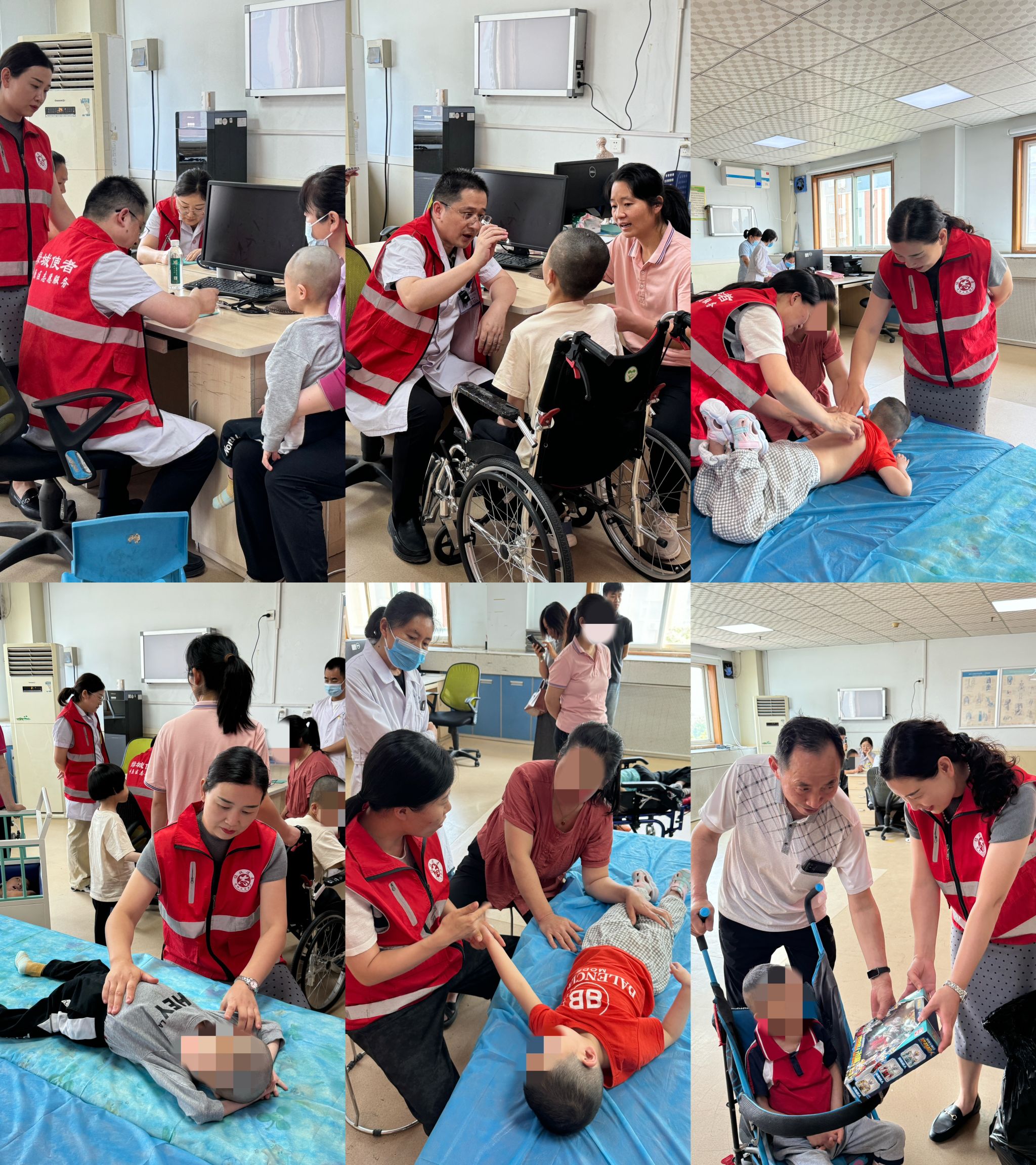 本次活动由儿科八区科室主任孙晓旭、护士长胡丽丽带队,携科室骨干医生、护士共6名医护志愿者组成义诊团队。团队结合福利院儿童的特殊需求,精心准备了疾病诊疗与咨询、健康宣教等多样化服务。现场为孩子们进行了心肺听诊、生长发育评估等基础检查,并针对常见儿童呼吸道疾病、营养发育问题进行了专业指导。护士们还手把手教护工们学习正确的推拿手法,便于孩子们日常生活中的脾胃调理。
