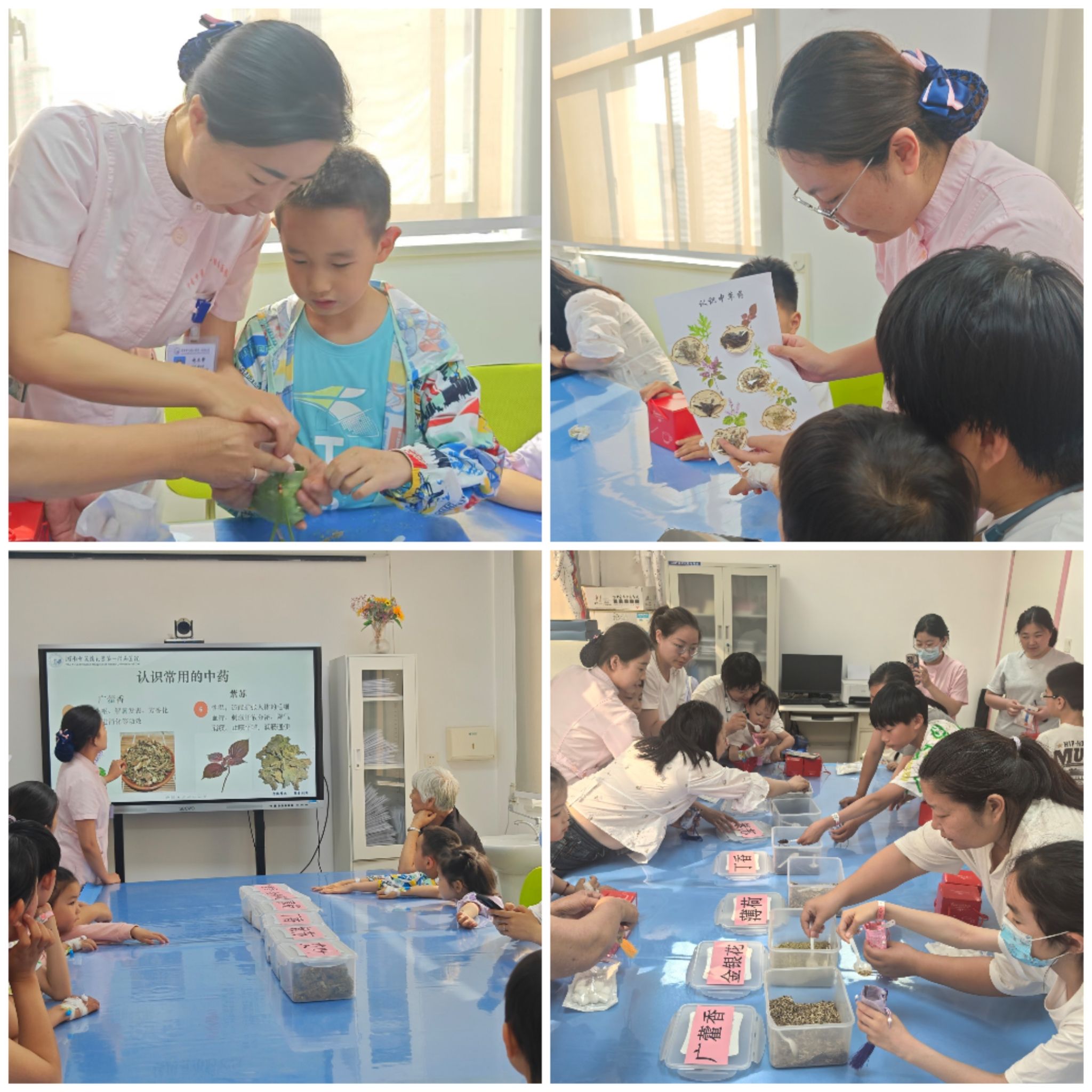 在文化宣讲环节,医护人员以“端午节的来源”为切入点,讲解了纪念屈原、龙舟竞渡、吃粽子等传统习俗,介绍了悬挂艾草、佩戴香囊的驱邪祈福寓意。同时,通过图文展示与香囊实物讲解,带领孩子们认识了艾叶、薄荷、丁香、金银花、广藿香、紫苏等常用中药,让孩子们直观感受习俗里的中医药文化智慧。