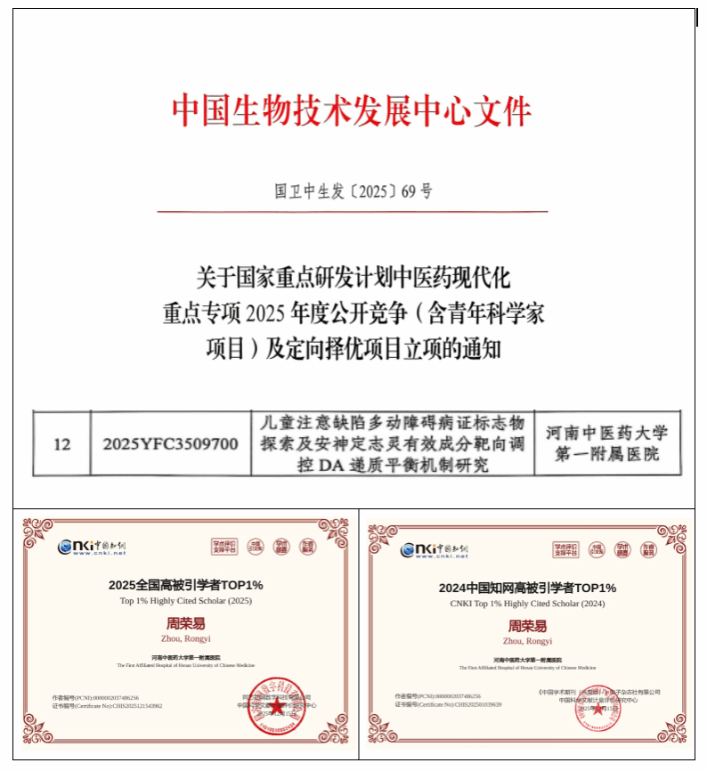 本网讯(文/图 韩姗姗)近日,中国生物技术发展中心正式公布2025年度国家重点研发计划“中医药现代化”专项(含青年科学家项目)立项通知,麦田影院 第一附属医院儿科医院周荣易教授作为负责人获批“儿童注意缺陷多动障碍病症标志物探索及安神定志灵有效成分靶向调控DA递质平衡机制研究”项目!同时,在近日中国知网公布的全国高被引学者名单中,凭借深厚的学术积淀与卓越的研究成果,周荣易教授连续入选2024、2025年度全国高被引学者TOP1%。