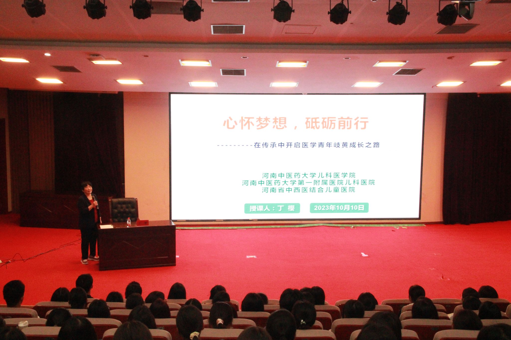 丁樱教授以《心怀梦想、砥砺前行——在传承中开启医学青年岐黄成长之路》为题展开讲座。她从幼时谈起,讲述了自己求学、从医至今的成长经历,从早年的坎坷多磨到潜心求学,从儿科发展初期的重重困难、迎难而上到至今的成绩斐然,以自身经历和感悟从三个方面对学生给予了殷切嘱托。在学习方面,教育引导同学们学习没有捷径,唯有勤奋,学海无涯,既要时时刻苦更要终生坚持,既要有目标又要有科学的规划,要始终抱有主动学习的热情。在为人方面,要做事先做人,做人先修德。要培养远大的格局、无私奉献的精神、宽厚包容的胸襟、豁达乐观的心态,树立吃亏是福的人生大智慧。在工作方面,经历就是财富,面对困难要有勇于挑战困难决心和战胜困难的坚持,要对所从事的事业持有发自内心的挚爱,用对事业的热爱激发自身最大潜能,成就个人的成长和事业的发展。最后丁樱教授强调当前中医药事业的振兴发展迎来了大好机遇,希望青年人能坚定信念,传承创新,担负起新时代中医药事业发展的时代责任。