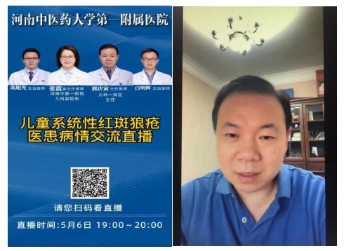 5月10日上午08:00,在“豫中一”云诊室,举行了“儿童系统性红斑狼疮云义诊”活动。在国医大师丁樱教授带领下,中原名医任献青教授、河南省名中医翟文生教授、黄岩杰教授、宋纯东教授、郭庆寅主任医师、张霞副主任医师等肾病风湿免疫团队专家悉数参加。云义诊活动,解决了狼疮患儿疫情期间“就医难”的问题,并对普及狼疮的规范化诊疗起到了积极促进作用。肾病紫癜诊疗中心主任翟文生教授指出,儿童系统性红斑狼疮相对成人来说起病早、病情重、变化快、病程长,需要规范诊治、全程化管理,更需要全社会的关注和呵护。