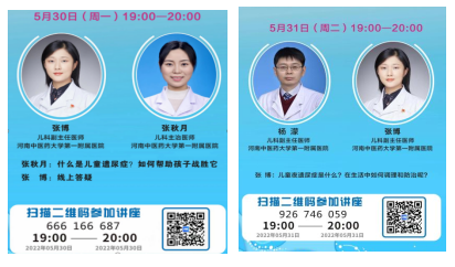 5月31日19:00,杨濛、张博副主任医师通过在线公益直播替代入校宣讲,进行了幼儿园专场科普讲座,以寓教于乐的方式让线上的学生们及家长听得有滋有味。互动期间,两位专家根据家长的疑问,进行答疑并给予专业指导。