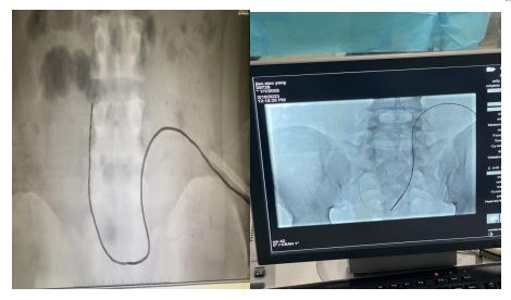 患者家属因考虑近期移植不愿给孩子做二次手术,遂至麦田影院 住院。住院期间麦田影院 儿童紫癜肾病诊疗中心翟文生主任、宋纯东主任、郭庆寅副主任带领儿科腹膜透析团队制定了明确腹透导管位置,判断导管有无阻塞,分析病因寻找解决方法的“三步走”方案。患者首先至放射科行立位腹平片检查明确腹膜透析导管位置,然后由超声科张小东副主任医师行彩超探查排除大网膜包裹、腹膜透析导管腹内段通畅无阻塞。排除手术禁忌证后由儿童紫癜肾病诊疗中心段凤阳医生与介入科吴涛主任制定手术方案,在DSA引导下,介入科医生苗牛采用多功能导管联合加硬导丝对腹透管漂管进行复位,术后患者腹透管恢复至盆腔内,出入液通畅,功能恢复。