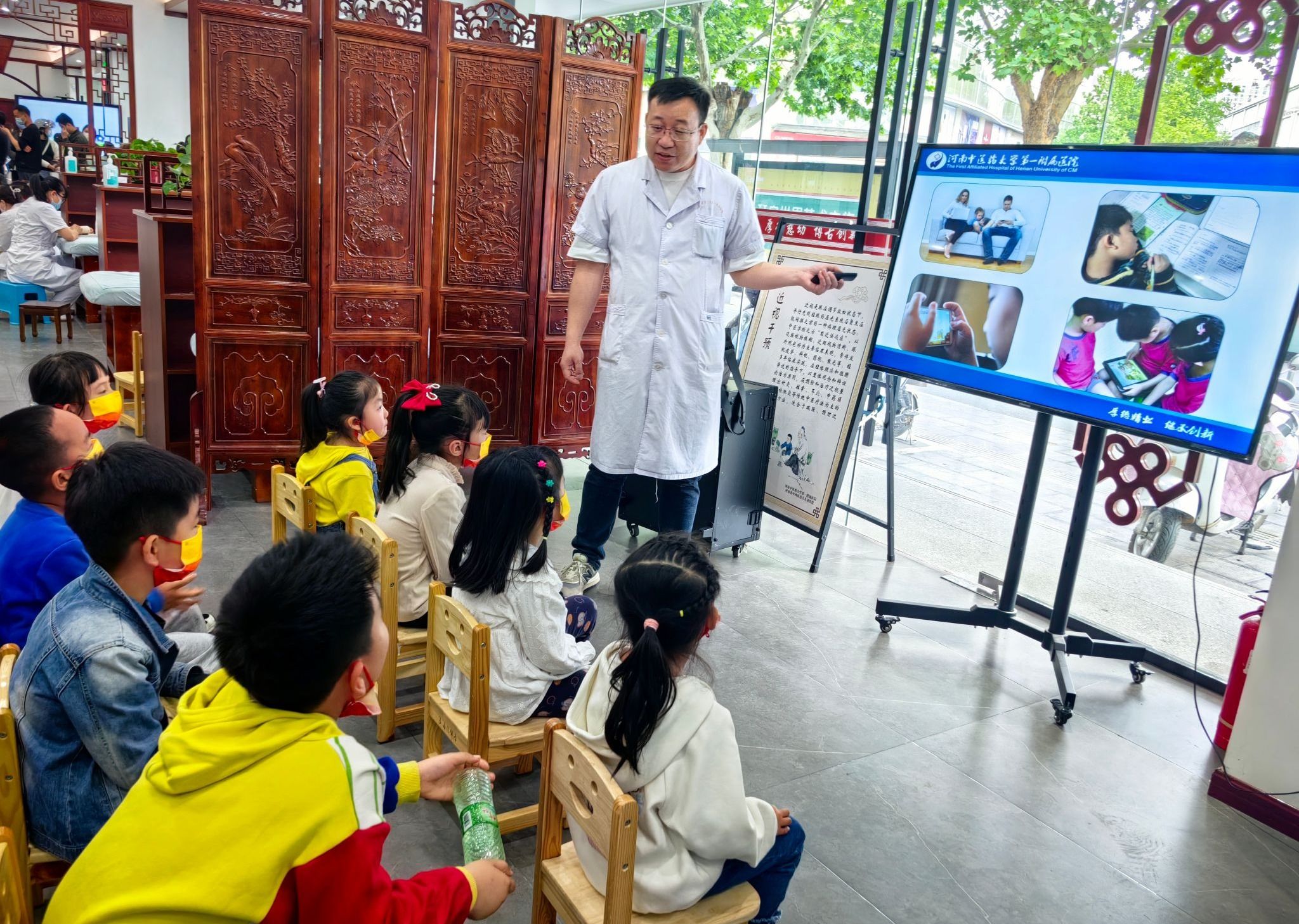 儿童传统特色诊疗部副主任李付根以《中医助力儿视健康知识普及》为题,给孩子们讲解了近视的危害,日常健康用眼注意事项,中医防治近视操作手法,讲座过程中设置了现场示范眼保健操和互动问答等环节,孩子们积极参与,踊跃互动。