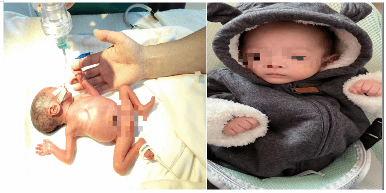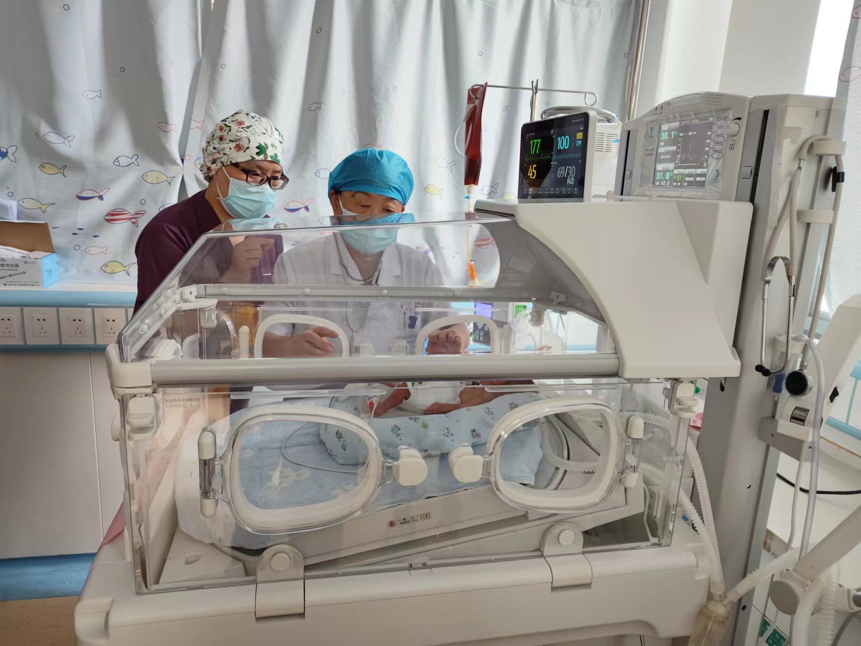 “小九百”在妈妈腹中仅仅待了28周就迫不及待的出生了,在剖宫产手术过程中,历经胎盘糟粕,羊水重度污染,产出后没有呼吸,体重仅有900克,心率逐渐下降,肤色青紫,生命垂危!医院立即启动新生儿科、产科、麻醉科等多科室协作机制,予气管插管,辅助呼吸,心脏按压等抢救措施,通过紧张的抢救,宝宝肤色好转,出现微弱的自主呼吸,心率恢复正常,随即转往PICU的新生儿重症监护室继续抢救治疗。