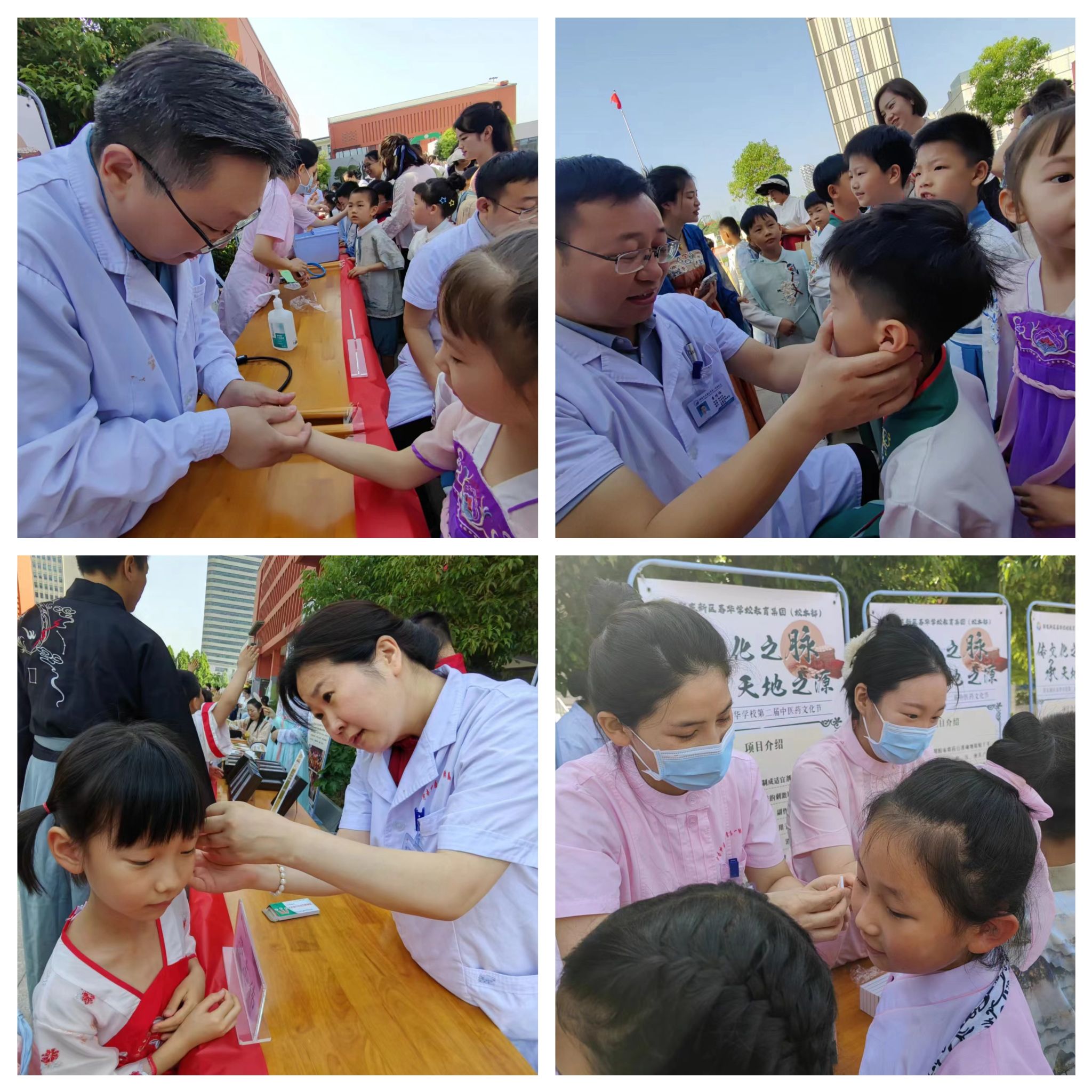 5月23日在郑东新区春华学校,管志伟为学生科普中医四诊理论,李付根为学生介绍中医推拿等外治法的诊疗特色,副主任医师任玉梅和护士郭玮、吕佳乐为学生开展耳穴压豆外治疗法演示,使参会师生进一步了解了中医药文化的独特魅力。