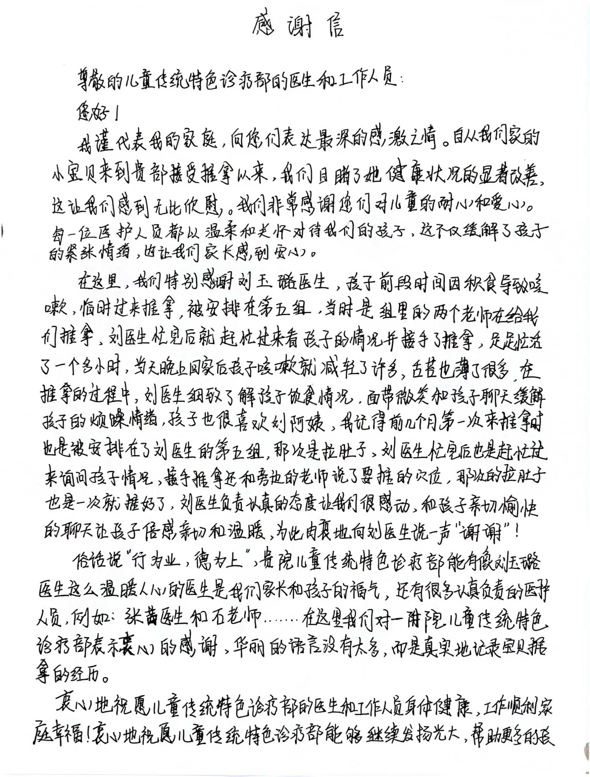 本网讯(文/郭文静 图/刘玉璐)9月23日下午,麦田影院 儿童传统特色诊疗部收到一封满载感激之情的感谢信,“多亏了你们,我孩子拖了那么久的咳嗽几次推拿就痊愈了,真的特别感谢,孩子在你们这推拿很开心也很舒适……”。质朴的语言表达了对麦田影院 医疗团队医术与服务的充分认可。