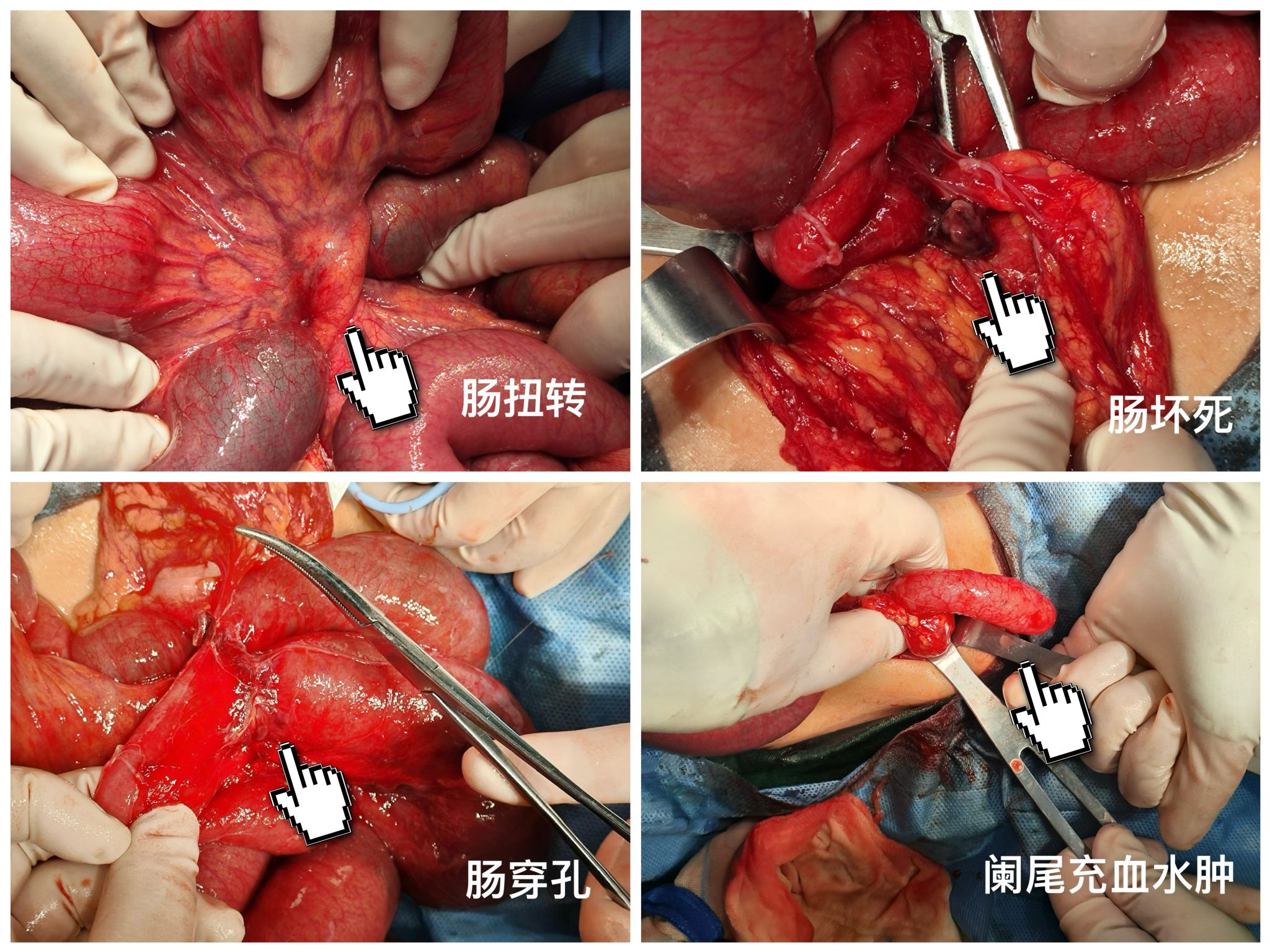 小儿外科主任常武会诊,通过平片结合患儿症状,诊断为:1、肠梗阻;2、肠扭转。考虑到如不及时手术治疗患者会出现肠管坏死危及生命,常武主任紧急安排夜间急诊手术治疗。小儿外科团队会同麻醉科、手术室、检验科等多部门医护人员紧密配合,于术中可见小肠空回肠交界处肠系膜逆时针扭转360度弥漫性充血、水肿、肠管充液扩张,阑尾充血水肿,肠管黏连、条索形成,肠管复位后小肠颜色恢复正常。距回盲部70CM处可见黏连条索卡压肠管,并有2.5公分的肠坏死。经过2个小时的奋战,顺利完成“肠扭转复位术+肠穿孔修补术+肠切除术+肠粘连松解术+阑尾切除术”。