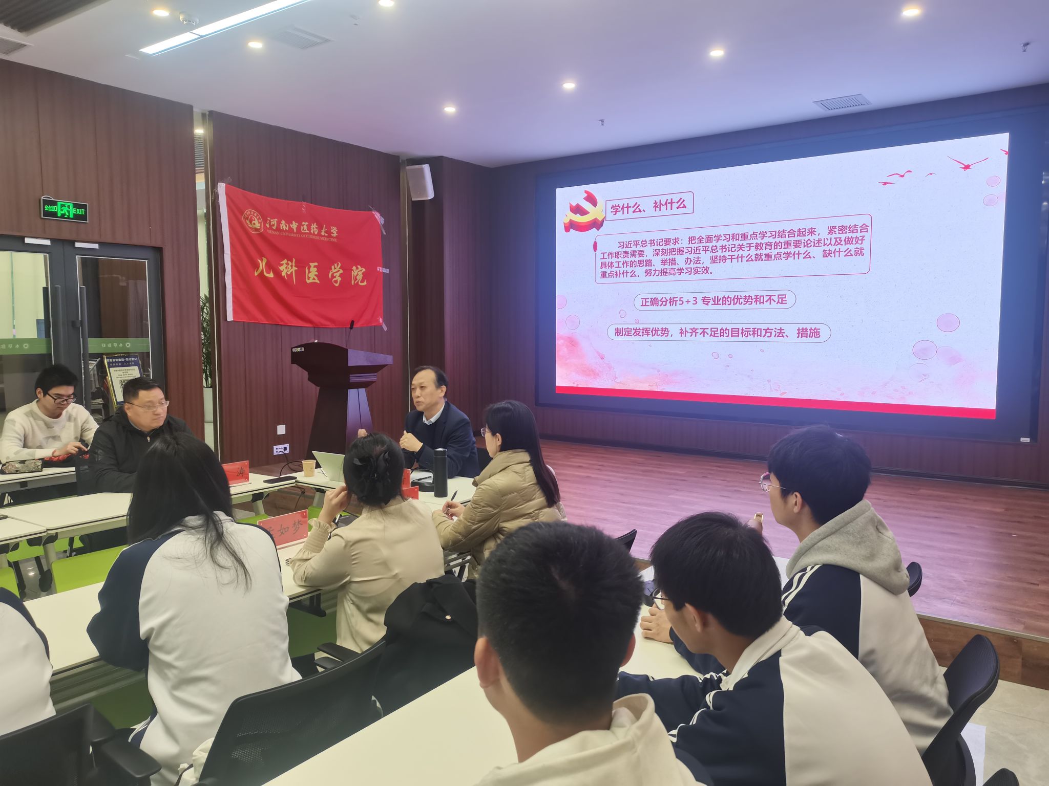 任献青以“学习贯彻习近平新时代中国特色社会主义思想主题教育”为主题,围绕“学思想、强党性、重实践、建新功”,引导同学们从学什么、补什么、怎么学,展开充分的分析讨论。任献青从习近平总书记关于中医药工作重要论述及指示精神谈起,引导学生要清晰的认识到中医药发展所面临的重大机遇。从初心使命谈起,引导学生要敢于直面挑战,认真学习,把握机遇,服务社会,实现人生价值。从“道、法、术”三方面,引导学生要善于发现规律、掌握方法、提高能力。他带领同学们共同分析讨论了8年长学制专业发展现状,存在的优势和不足,制定“发挥优势,补齐不足”的目标、方法和措施,强调在学习中,要坚持干什么就重点学什么、缺什么就重点补什么,努力提高学习实效。调研座谈会中,同学们纷纷踊跃发言,积极互动,围绕座谈主题畅谈体会和困惑。