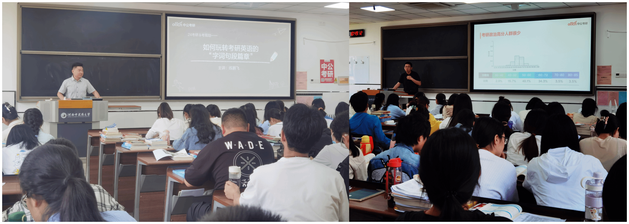 中公教育讲师从备考整体规划、备考重点、答题技巧、注意事项等方面为同学们进行英语与政治备考的全面讲解。前半场的英语指导,讲师把备考以月份为单位进行了划分,讲解了每个月的重点任务,以单词记忆为切入点,讲解了单词的记忆方法,以阅读理解为例介绍了答题思路与技巧。后半场政治指导,讲师以风趣生动的授课方式,从历年真题各题型占比出发,为同学们分析了考试重点,介绍了各类题型的解题思路和方法技巧。